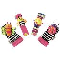 Description: Baby-soft wrist rattles and foot finders encourage discovery for baby. Bright patterns and faces, with fun sounds to reward exploration. Ideal for developing hand-to-eye coordination skills.Machine washable.