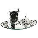 Description: null A must have addition to her dressing table, this irresistible black and silver glass tray set will make a gorgeous gift. Featuring an exquisitely designed perfume bottle, trinket box and 2" x 3" picture frame, what more could a girl ask for?