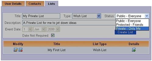 • Protected - Lists of this type are accessible by the list owner and any people who they have specified as contacts. They generate news to enable contacts to keep up to date with changes to the list. Contacts can also see these lists in searches.