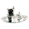 Description: null What girl could resist this must have addition to her dressing table? A gorgeous gift, this pretty silver, orange and cream glass tray set features a beautifully designed perfume bottle, trinket box and 2" x 3" picture frame.